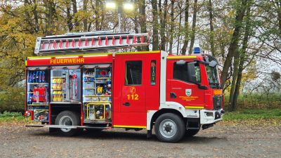 Das fabrikneue Löschgruppenfahrzeug vom Typ LF10 wird der Wehr offiziell übergeben und damit in Dienst gestellt.