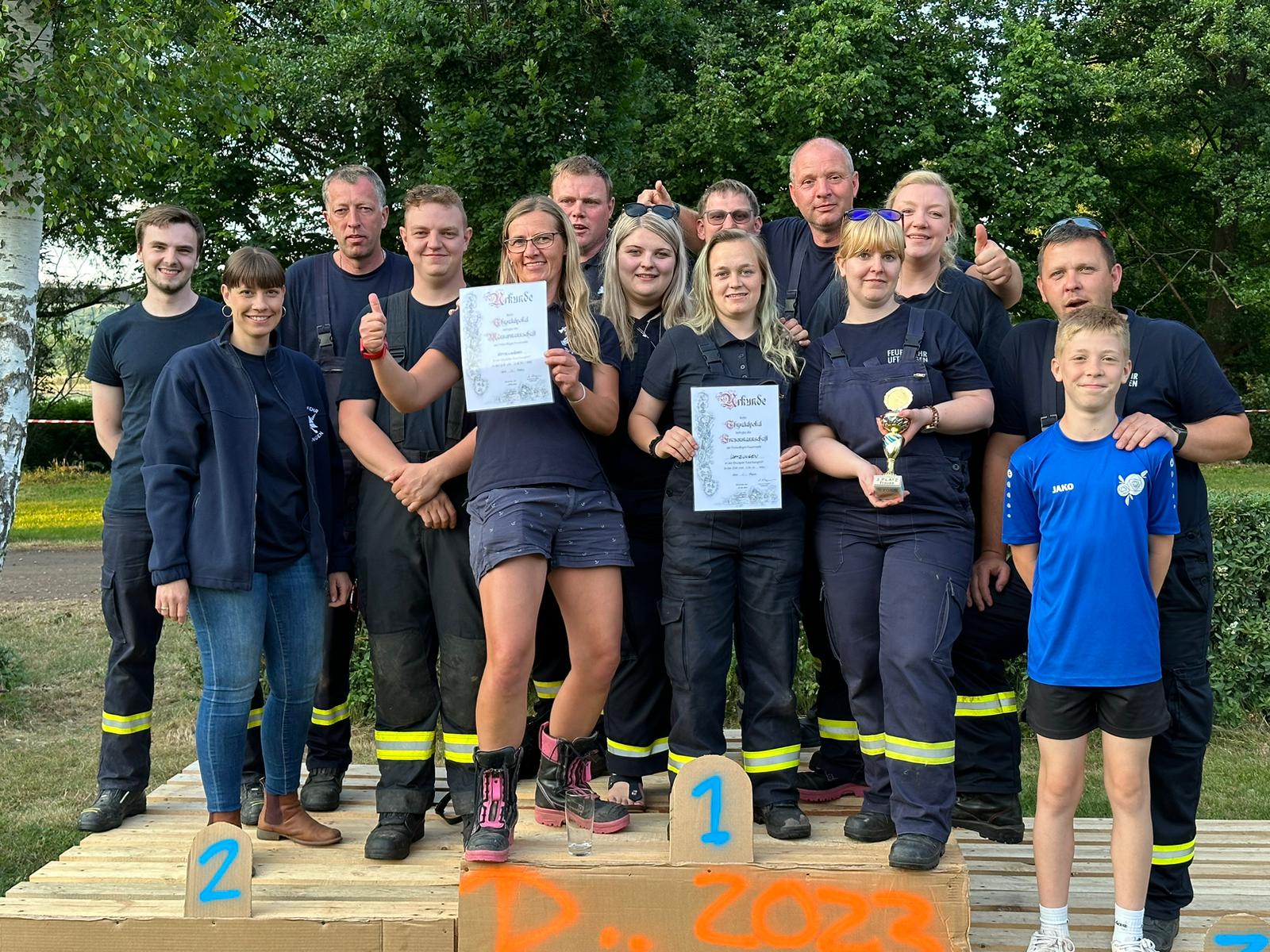 Für Samstag, 18. Juni, waren zunächst die Wettbewerbe der Männer- und Frauenmannschaften in der Disziplin "Löschangriff nass" angesetzt. Hier gingen wir mit einer Männermannschaft und das erste Mal seit vielen Jahren auch mit einer Frauenmannschaft an den Start.